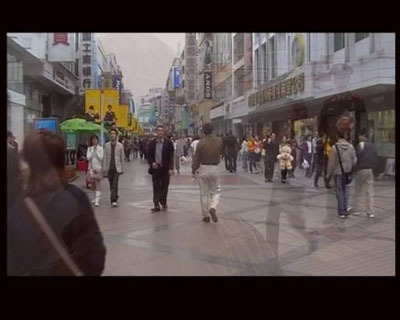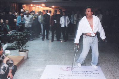 現(xiàn)場投影有關(guān)作者不同時期,不同身份、面貌、氣質(zhì)的圖片(如:身份證上的標準照、身著傳統(tǒng)服飾的標準照、標準白領(lǐng)照、“新人類”照、有福相的大頭照、極具痞氣的面容等),這不僅是關(guān)于人群在試圖適應新的社會經(jīng)濟體制時對于自己身份的困惑,也凸現(xiàn)出了現(xiàn)實中種種精神氣質(zhì)的對立。