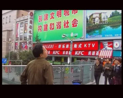 現(xiàn)場大屏幕電視同時面向觀眾播發(fā)著DV短片:《病人羅子丹的一天》,這是對于羅平常一天的忠實紀錄:羅從自己郊區(qū)的住處來到城市的中心,一路上克制著自己脖頸不由自主的痙孿與扭動,并和不同的現(xiàn)場自然感應。