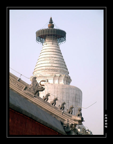 妙應(yīng)寺建于元至元八年(1271年),初名大圣壽萬安寺,至正二十八年(1368年)曾遭火焚,于明宣德八年(1433年)再建,改稱妙應(yīng)寺。因寺內(nèi)有通體涂以白堊的塔,俗稱白塔寺,F(xiàn)寺內(nèi)的建筑大都為清代所建,僅白塔在火焚中幸免,為元代遺物,至今已700余年。1978年對(duì)白塔進(jìn)行了維修加固。施工過程中,發(fā)現(xiàn)了清代乾隆十八年(1753)存留在高塔頂部鎏金小境內(nèi)的大藏經(jīng)、木雕觀世音像、補(bǔ)花袈裟、五佛冠、乾隆手書《波羅蜜多心經(jīng)》、藏文《尊勝咒》、銅三世佛像、赤金舍利長(zhǎng)壽佛等。