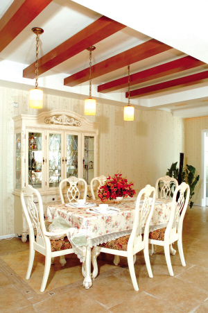 玄關(guān)與走道上有花飾的木柜,讓我們感覺(jué)到了鄉(xiāng)情鄉(xiāng)意。柜子在這里傳遞著信息,與其他室內(nèi)物件相結(jié)合,以免突兀。鄉(xiāng)村風(fēng)格家具的外觀和用料仍保持自然、淳樸的風(fēng)格,隱藏設(shè)計(jì)的抽屜收納了空間,使其看起來(lái)更整潔、美觀,本案中的家具都集中體現(xiàn)了這一思想。因?yàn)槊朗郊揖邆鬟_(dá)了單純、休閑、有組織、多功能的設(shè)計(jì)思想,讓家庭成為釋放壓力和解放心靈的凈土。