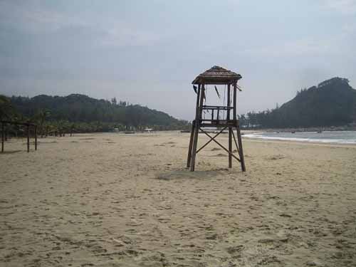 位于海陵島西南端,三面環(huán)山,南面臨海,灘長(zhǎng) 0.6 公里,寬 60 — 150 米,沙質(zhì)細(xì)膩、水質(zhì)清潔、灘平波緩、呈螺線形灣。海灣背依平原腹地,左右馬尾山與望 暸 嶺對(duì)峙;灘東南側(cè)座落弧丘鐵帽仔,鐵帽仔與望 瞭 嶺間形成狹窄的石灘,其中海盜藏寶洞、仙女洞、一線天等景色迷人;沙灘東北側(cè)有天然瀉湖穿過(guò),構(gòu)成了豐富的地貌和多層次的景觀。登鐵帽仔遠(yuǎn)望,南面是碧波萬(wàn)頃,北面是田園風(fēng)光和濱海風(fēng)光兼收并蓄,所有美景盡收眼底。