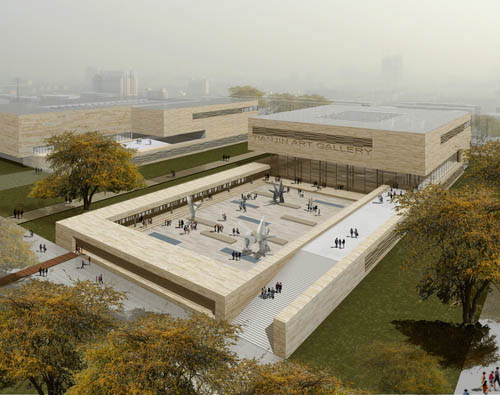 這座建筑物具有雕塑風(fēng)格,地塊四周?chē)@著天然石材制成的圍欄,為中國(guó)書(shū)法、西方藝術(shù)、雕塑藝術(shù)與現(xiàn)代藝術(shù)這四項(xiàng)長(zhǎng)期展覽提供展出場(chǎng)所,還有五處展廳用于當(dāng)時(shí)的巡回展覽。美術(shù)館建筑位于雕像園的環(huán)繞之中。上層有一處工作室區(qū)域,這里可以進(jìn)行深入的討論,也可以積極操控博物館的運(yùn)營(yíng)。整個(gè)展館的設(shè)計(jì)方案還包括圖書(shū)館、咖啡館和餐廳以及必要的管理區(qū)域。2009 年12 月即將開(kāi)土動(dòng)工。
