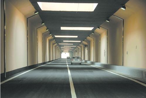 整個下穿隧道呈米黃色,顯得十分典雅。該隧道自然采光,隧道頂部共開了24個錯落有致的大天窗,每個長4.5米、寬6米,不僅采光良好,也更加通風(fēng),“這在成都還是首創(chuàng)”。