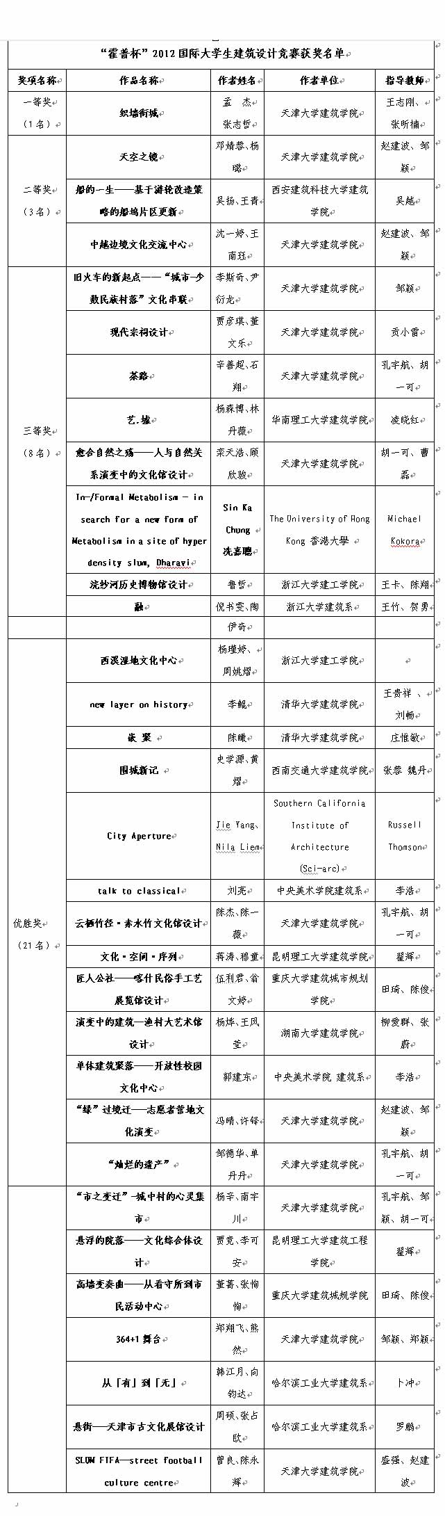 榮獲“霍普杯”2012國(guó)際大學(xué)生建筑設(shè)計(jì)競(jìng)賽二等獎(jiǎng)的三個(gè)參賽作品以及三等獎(jiǎng)的八位獲得者分別由天津大學(xué)建筑學(xué)院、西安建筑科技大學(xué)建筑學(xué)院、華南理工大學(xué)建筑學(xué)院、新德里建筑與城市規(guī)劃學(xué)院以及浙江大學(xué)建工學(xué)院共同摘得。