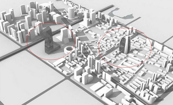 最終方案中的人民日報新大樓,由圓形高層和方形輔樓組合成“天圓地方”的建筑形式,從三個“角”上以外凸渾圓的巨大鋼柱沿弧線直接交匯到樓頂,從空中俯瞰,形成一個三角形的“人”字。