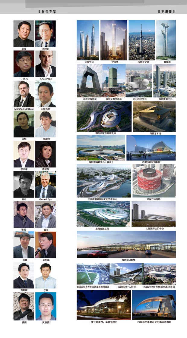 13 范重,中國(guó)建筑設(shè)計(jì)研究院副總工程師 主講內(nèi)容:用結(jié)構(gòu)技術(shù)創(chuàng)新助力建筑創(chuàng)作(結(jié)合奧運(yùn)瞭望塔、首博、鳥(niǎo)巢、鄂爾多斯東勝體育場(chǎng)、國(guó)家網(wǎng)球館、蘇州火車(chē)站等) Improving Architecture design by Creating Structure