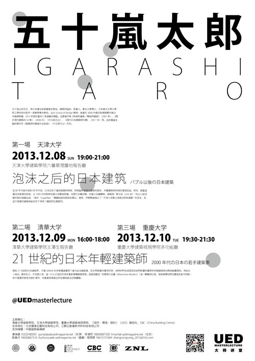 作者簡(jiǎn)介: 五十嵐太郎先生,系日本著名新銳建筑史學(xué)家、建筑評(píng)論家、策展人,東京大學(xué)博士,日本東北大學(xué)大學(xué)院工學(xué)研究科都市・建筑學(xué)專攻教授,仙臺(tái)School of Design教師。曾擔(dān)任2008年威尼斯建筑雙年展日本館總策劃,2013年愛(ài)知藝術(shù)三年展藝術(shù)總監(jiān)。主要著作有《終結(jié)的建筑/開(kāi)始的建筑》(2001年)、《關(guān)于現(xiàn)代建筑的16章》(2006年)(中文版已出)、《現(xiàn)代日本建筑師列傳》(2011年)等。由其擔(dān)當(dāng)主編的著作有《建筑師的畢業(yè)作品訪談》(中文版已出)系列。 具體議程: 第一場(chǎng):2013年12月08日 天津大學(xué) 時(shí)間:19:00-21:00 地點(diǎn):天津大學(xué)建筑學(xué)院六層華潤(rùn)置地報(bào)告廳 主題:泡沫之后的日本建筑 第二場(chǎng):2013年12月09日 清華大學(xué) 時(shí)間:16:00-18:00 地點(diǎn):清華大學(xué)建筑學(xué)院王澤生報(bào)告廳 主題:21世紀(jì)的日本年輕建筑師 第三場(chǎng):2013年12月10日 重慶大學(xué) 時(shí)間:19:30-21:30 地點(diǎn):重慶大學(xué)建筑城規(guī)學(xué)院多功能廳 主題:21世紀(jì)的日本年輕建筑師