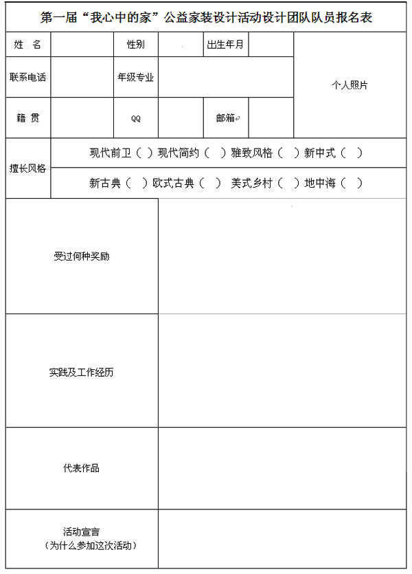 附: 1.第一屆“我心中的家”公益家裝設(shè)計(jì)活動(dòng)設(shè)計(jì)團(tuán)隊(duì)隊(duì)員報(bào)名表 2.參與“我心中的家公益家裝設(shè)計(jì)活動(dòng)”免費(fèi)家裝設(shè)計(jì)申請表