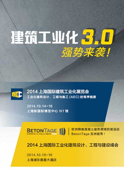 “2014上海國(guó)際建筑工業(yè)化展覽(BIC2014)”將于10月14-16日在上海新國(guó)際博覽中心(N1館)隆重召開,展出面積8,000平方米,參展企業(yè)100家,以“AEC的有序鏈接”為主題,同期舉辦“2014 上海國(guó)際建筑工業(yè)化建筑設(shè)計(jì)、工程與建設(shè)峰會(huì)——BetonTage asia”(歐洲混凝土最具規(guī)模的年度活動(dòng)BetonTage亞洲首秀)和上海地區(qū)建筑工業(yè)化項(xiàng)目考察活動(dòng),預(yù)計(jì)將迎來(lái)專業(yè)觀眾6,000人。