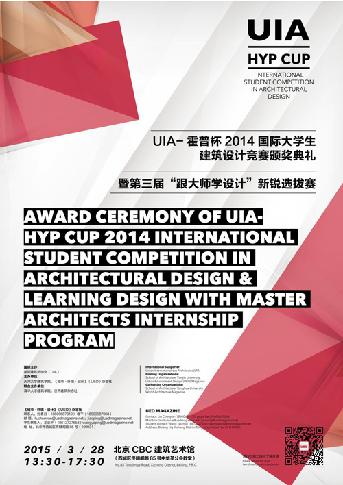 UIA-霍普杯2014國(guó)際大學(xué)生建筑設(shè)計(jì)競(jìng)賽頒獎(jiǎng)典禮暨"跟大師學(xué)設(shè)計(jì)"新銳選拔賽將于2015年03月28日在北京CBC(China Building Centre)舉行。