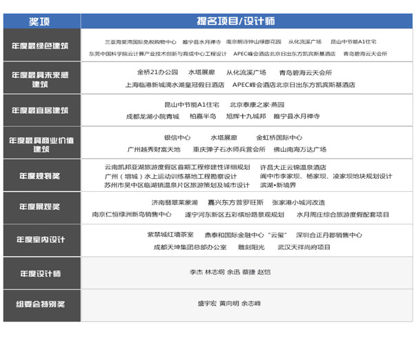 建筑新傳媒獎(jiǎng)大賽歷時(shí)6個(gè)多月,收到來自全球的數(shù)千份優(yōu)秀作品,競爭格外激烈。經(jīng)過了數(shù)月的角逐,建筑新傳媒獎(jiǎng)的最終獲獎(jiǎng)項(xiàng)目共22項(xiàng),其中,年度最具未來感建筑、年度最宜居建筑、年度最具商業(yè)價(jià)值建筑、年度景觀獎(jiǎng)、年度室內(nèi)設(shè)計(jì)獎(jiǎng)各3項(xiàng),年度綠色獎(jiǎng)4項(xiàng),年度規(guī)劃獎(jiǎng)、年度設(shè)計(jì)師、組委會(huì)特別獎(jiǎng)各1項(xiàng)。