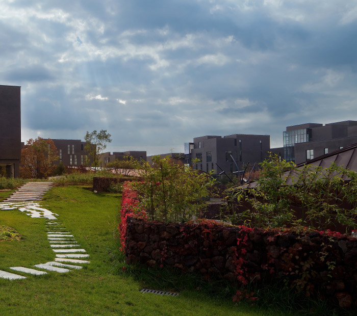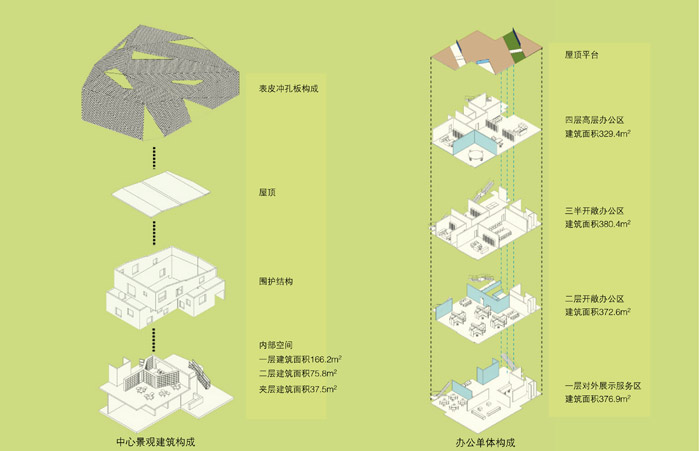 由于項目的總體規(guī)模提前進行了控制,在空間承載力方面不像很多辦公工廠等項目的壓力那么大,一期秉用地面停車的最大化提供辦公的便利,停車位與景觀是同步設計的,因此當這里正式投入使用以來,無論是行進中的還是停在樹蔭下的車都是生產(chǎn)景象的一部分,是一種現(xiàn)代美學,二期綜合樓為主的辦公區(qū)的地下設置了停車場,為地面設置了一個非正式交流的開放大堂。這個露天大堂即將成為新的生產(chǎn)力,促進空間。改變上班族各單位自我封閉的歷史。
