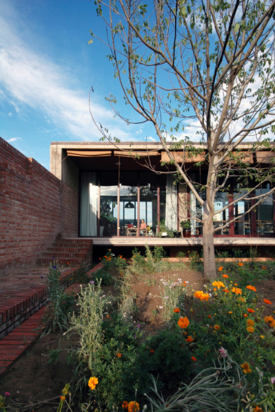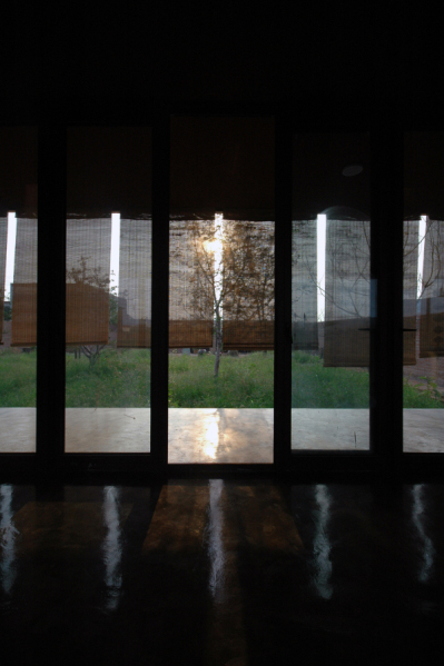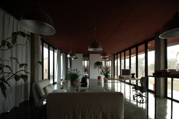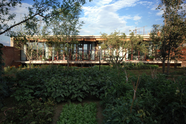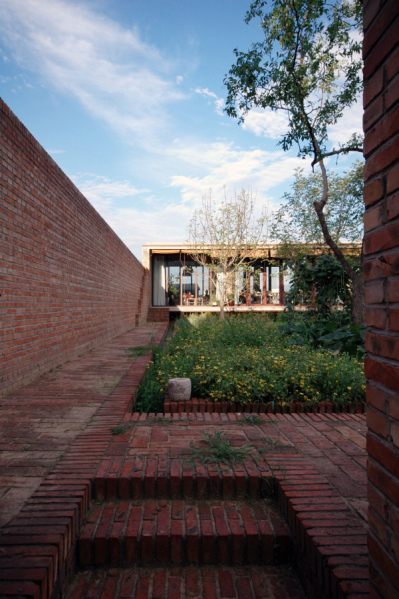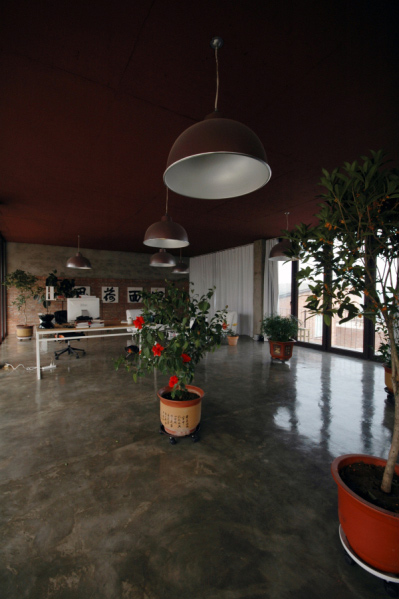 “百子甲壹”的大門,開在靠近基地西側(cè)的村級路邊,院落由西向東形成五“進(jìn)”空間,先上后下,起伏跌宕逐漸向水塘下跌:第一“進(jìn)”,進(jìn)入大門是個小院子,地平面略高于門外路面,是停車、庫房、鍋爐房以及人員進(jìn)出的緩沖空間。小院迎面是一道類似傳統(tǒng)照壁的花墻,阻隔了人的視線。第二“進(jìn)”,人們通過花墻照壁由兩側(cè)——北側(cè)是臺階,南側(cè)是緩坡,無論拾階而上,還是沿坡緩行,繞過花墻,眼前豁然開朗,居然一派“田園風(fēng)光”:整個院子以彎彎曲曲的田埂為界,劃分成幾十塊“田地”,花卉菜蔬,五顏六色,加上林蔭綽約的七棵果樹,頗有一點農(nóng)家意味。透過果樹的掩映,就是院子第三“進(jìn)”的主建筑了,為了突出院子的開闊,有意把地上的建筑體積縮小,其余的隱藏在地下,地上部分是25米面寬,6.9米進(jìn)深,3米層高的長方形工作室,屋頂挑檐和地面——即作為地下部分的屋頂挑檐,形成兩條平行直線,夾在中間的是三面落地玻璃,而挑檐部分自然成為環(huán)繞建筑的一圈室外走廊,這個設(shè)計不但使得院子外的“田園風(fēng)光”映照在玻璃上,由于室內(nèi)頂部涂成深色,又讓建筑內(nèi)部向外形成一個開放的視野,尤其進(jìn)入建筑內(nèi)部,向東看去,俯視加廣角,整個水面盡收眼底,僅僅一百畝的水塘,似乎感覺浩浩瀚瀚地向我們涌來,正如彭樂樂說的“我想讓水面漫上來,我想讓水面漫到園子,想讓水面漫到屋面!边@種空間的開放感,讓我想到拙政園的“遠(yuǎn)香堂”,但“百子甲壹”向外借的是真正的自然景觀。