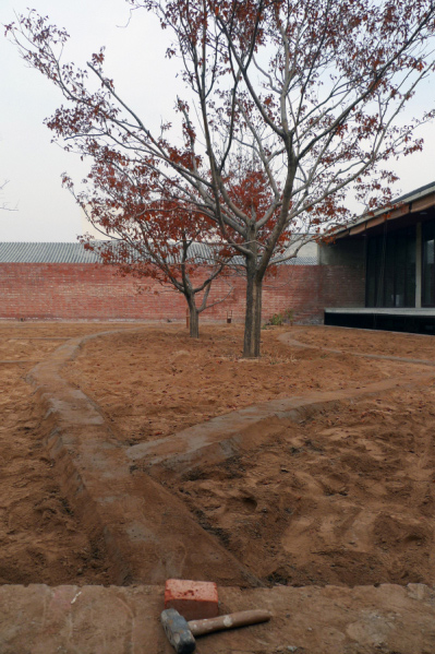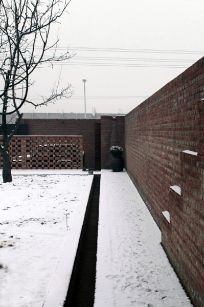 最有創(chuàng)意的設(shè)計,是第四“進(jìn)”、第五“進(jìn)”的私人空間,它隱藏在“田園院子”的背后,向水塘方向下沉3.9米,人們只有進(jìn)入工作室,或者走到東邊走廊時,才可以俯視到整個私人生活區(qū)。與工作室的整體性相對比,私人空間強調(diào)的空間小而多,五六個似乎是單體的小房,高高低低,錯錯落落,并由此形成的三四個小院,也是大大小小,開開合合,似有一種江南小筑的味道。為了讓每一個獨立“小筑”的體積更完整,設(shè)計強調(diào)單坡瓦頂?shù)拿娣e投影和每一個建筑體相等,四周沒有挑出,只有大小頭瓦的直接收邊。尤其單坡的灰色瓦頂,選用了北方農(nóng)村最常見的干槎瓦鋪法,在形態(tài)上更接近水波紋,并與水面渾然一體。而水漫上來的感覺,正是通過庭院模仿波紋的小青瓦鋪地和中遠(yuǎn)景真實的水紋波動,與屋頂波紋在視覺上的連續(xù)“傳送”中造成的。