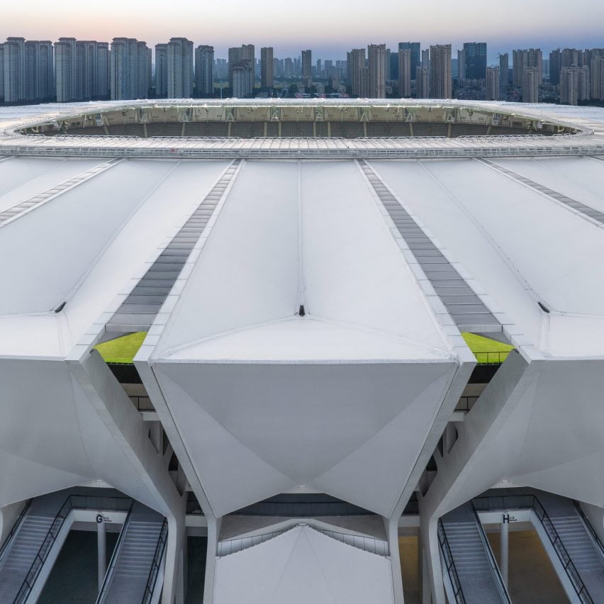 德國GMP Architekten工作室在中國完成了昆山奧林匹克體育中心(Kunshan Olympic Sports Centre),這是一座可容納45000個座位的足球場,通過一圈高架橋和人行道“無縫連接”到公園場地。