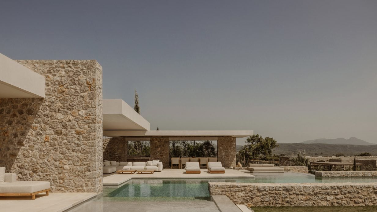 垂直的石墻與水平的混凝土平面相交,構(gòu)成了“向南屋”(Southwand House)度假屋的房間和露臺(tái)的框架。“度假屋”由K-Studio工作室設(shè)計(jì),位于希臘的墨西尼亞地區(qū)(Messinia)。