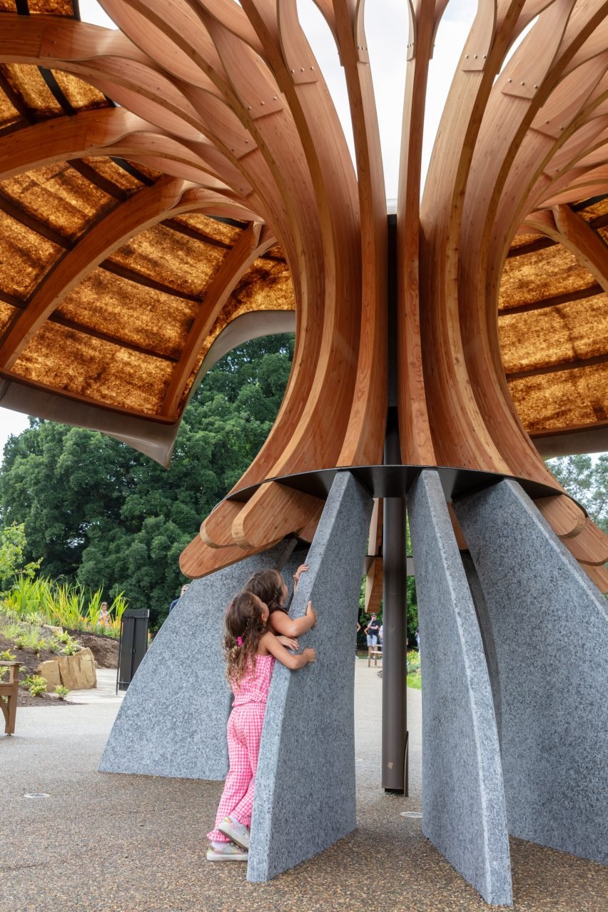 倫敦邱園的碳花園展館(Carbon Garden Pavilion)由建筑設計師米茲工作室(Mizzi Studio)設計,其華麗的木質結構上覆蓋著一個用亞麻制成的半透明屋頂。