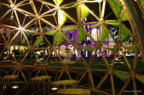該項目在首次試驗之后于2006年完工,為當(dāng)今無損并易于組裝的新型材料及機械連接做出了進(jìn)一步的詮釋。竹制網(wǎng)格狀球頂原型——被切割成板狀的竹子通過鋼材與氯丁橡膠相連,形成一種復(fù)雜并具有靜態(tài)性能的網(wǎng)格狀幾何(此結(jié)構(gòu)可承受自身約30倍的重量)——輕快,時尚,功能多樣。玻璃面板及光伏電池集成,與半透明的紡織物構(gòu)成了外層包膜,而夯土地面則為其提供了穩(wěn)定性。