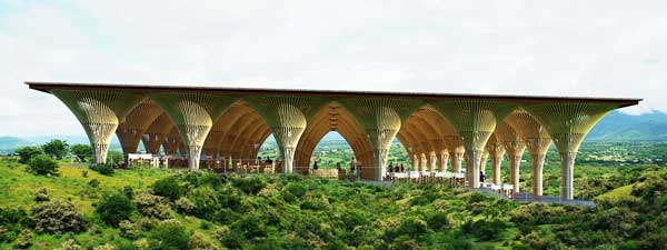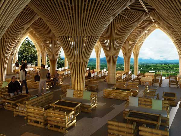 山頂餐廳坐落在墨西哥庫埃納瓦卡附近的一座植物花園里。地面隨著地勢逐漸降低,被巨大的平面屋頂覆著,并由蘑菇型竹柱支撐而起。將近160根竹子構(gòu)成了一根蘑菇型竹柱,屋頂面積超過36平方米。墨西哥的瓜多竹,其牢度及硬度都要強(qiáng)于越南的竹子,根據(jù)這一特性,我們減少了竹子的彎曲程度,以展現(xiàn)墨西哥竹建筑的獨特魅力。該項目由墨西哥人與越南人共同完成,呈現(xiàn)了竹結(jié)構(gòu)在應(yīng)用上的多樣性。
