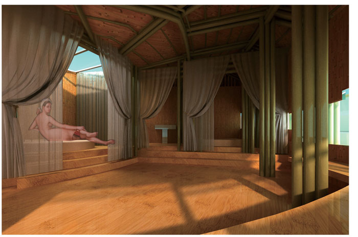 The hotel is intended as a spiral lies on the flat farmland, the spiral slab which gradually upraises rooms onto different levels with an uninterrupted incline, reminiscently responds the existing preserved dragon kilns in the site. On that account, the hotel is taken into consideration from dragon kiln through sloping slab, instead of standard rooms. Structurally, the hotel is consisted of two components, the core bearing wall made of bricks fired in local kiln, and the posts ranged along the contour of the irregular circumference, made of 100mm diameter local bamboos.