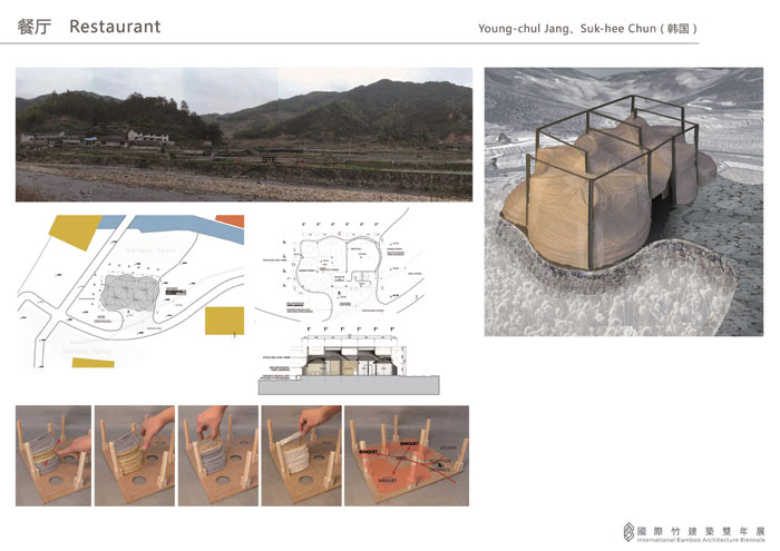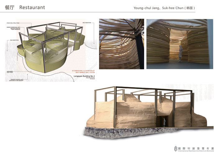 竹子彎曲時,更具承重力。因此,我們用這種造型作為內(nèi)墻及屋頂結(jié)構(gòu),無需額外的支撐,通透卻不失隱秘性。這樣,不僅節(jié)約了建造成本,還為環(huán)保節(jié)能型建筑提供了示范作用。餐廳的九宮格結(jié)構(gòu)與幾何造型體現(xiàn)了獨特的建筑魅力,其主結(jié)構(gòu)節(jié)點以鋼筋作為主軸,利用彎曲的竹子構(gòu)成不同的曲面,如同竹海中錯落的山脈。