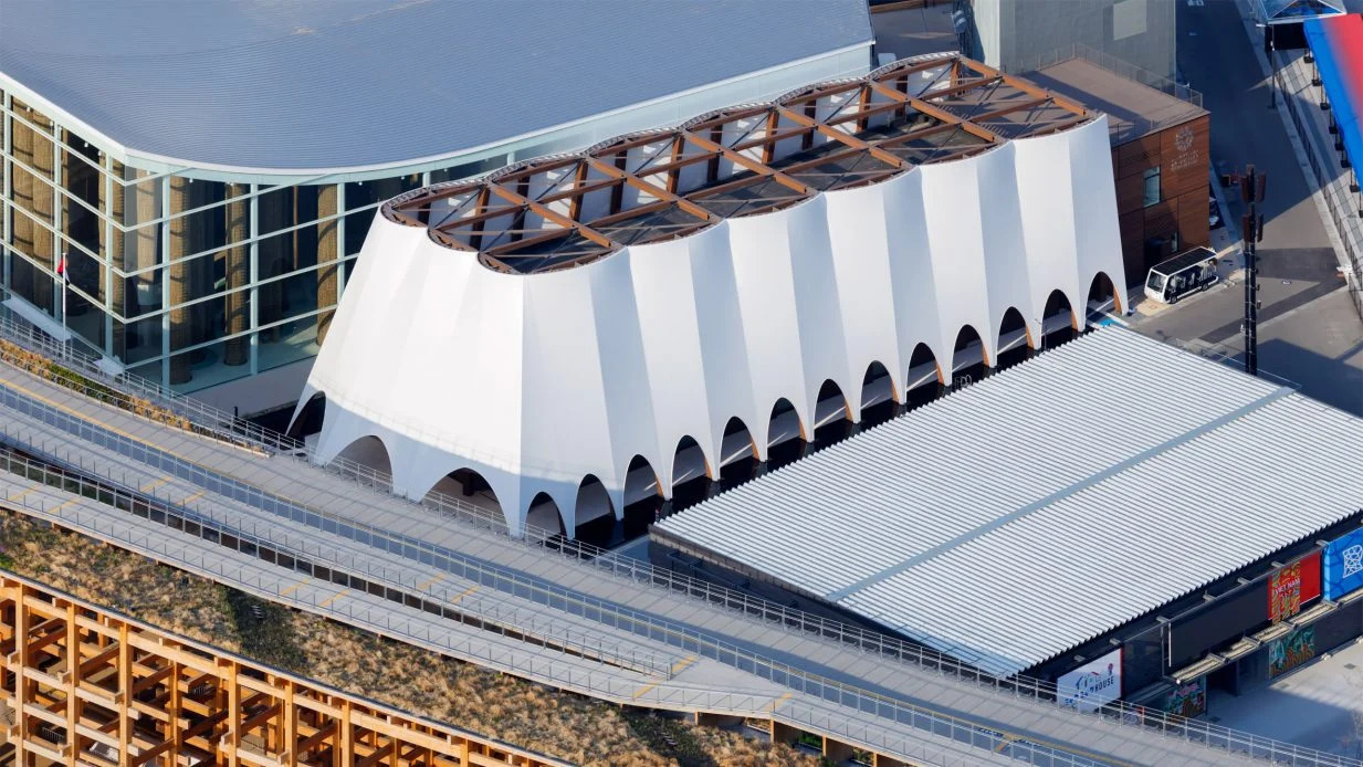世博會(huì)的所有展館都包含在一個(gè)由日本藤本壯介建筑師事務(wù)所(Sou Fujimoto Architects)設(shè)計(jì)的環(huán)形木結(jié)構(gòu)內(nèi),該建筑被稱為世界上最大的木結(jié)構(gòu)。