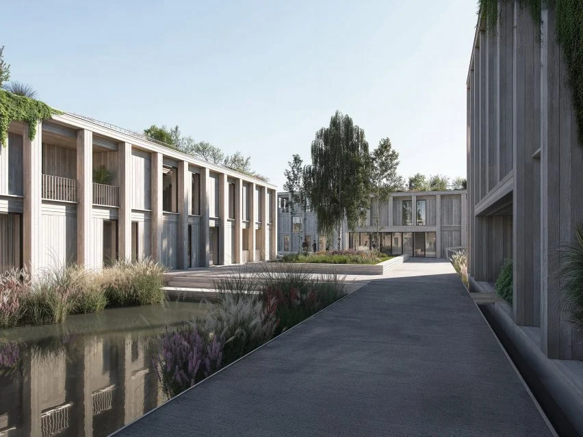該項(xiàng)目的效果圖顯示了一系列模塊化建筑,配有直線開(kāi)口和公共屋頂露臺(tái)。這些將通過(guò)鋪好的人行道連接起來(lái),人行道上點(diǎn)綴著綠地和指定的游泳區(qū)。