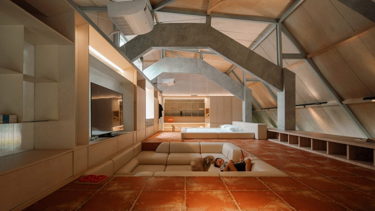 角形混凝土屋架構(gòu)成了這座印度尼西亞房屋頂部的靈活開放式閣樓,該房屋由雅加達(dá)當(dāng)?shù)毓ぷ魇襌AD ar翻修。