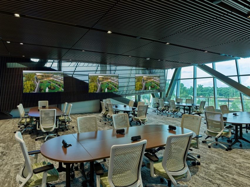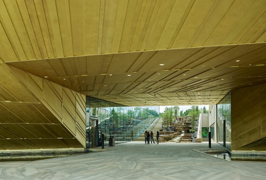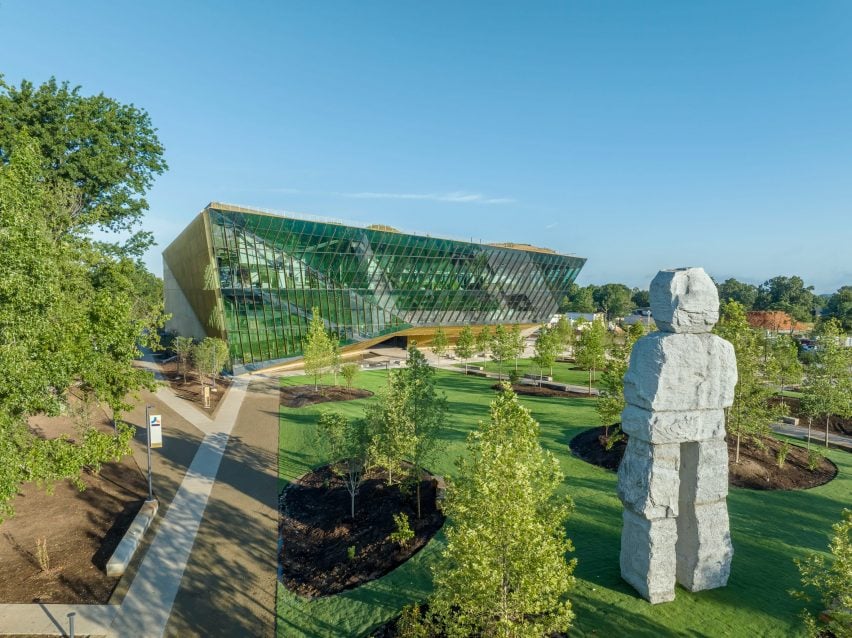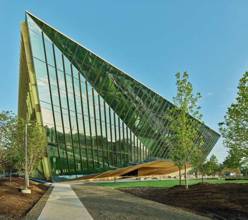 這個(gè)醫(yī)學(xué)院是一棟四層樓高的建筑,有一個(gè)傾斜的形狀和傾斜的屋頂公園,公園由紐約戰(zhàn)略設(shè)計(jì)工作室(Office of Strategy+Design)設(shè)計(jì),據(jù)該團(tuán)隊(duì)稱,該公園是根據(jù)周圍的“奧扎克地質(zhì)”情況設(shè)計(jì)的。