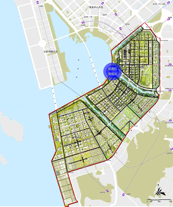 本次競賽的前海石景觀島位于桂灣河水廊道入海口,作為前海水廊道系統(tǒng)中間的一條指狀水廊道,西起前海灣,東至設(shè)計環(huán)狀水廊道,北接濱海大道,南接前灣一路,東西總長約1928m,水廊道總寬度245m,河道主槽底寬度40m,將形成“一槽兩灘雙溝”的空間格局,創(chuàng)造獨(dú)一無二的城市水意象和標(biāo)志性綠色開放空間。