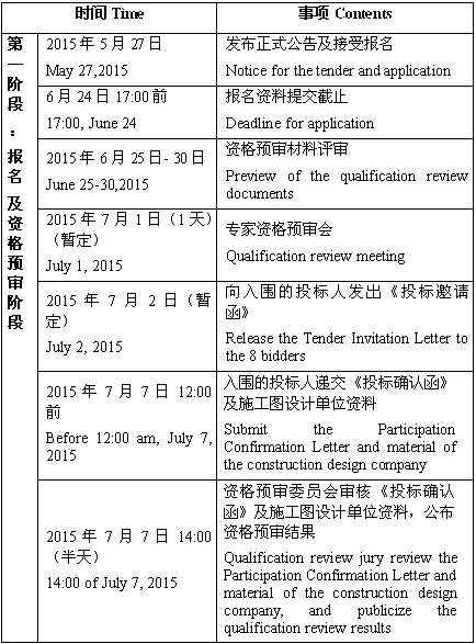 本次招標(biāo)工作分為兩個(gè)階段進(jìn)行:第一階段為公開(kāi)報(bào)名及資格預(yù)審階段;第二階段為設(shè)計(jì)競(jìng)標(biāo)階段。