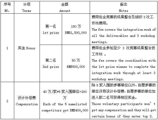 5家入圍參賽單位在提交符合競賽文件要求的成果后,將分別獲得40萬元人民幣設(shè)計補償費。除5家入圍的參賽單位以外,自愿參賽的單位沒有設(shè)計補償費,自愿參賽的單位如進入前二名可獲得相應(yīng)獎金。