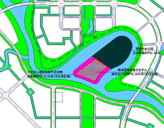 文化中心用地范圍位于里水河紅旗灣中心島嶼西南段、里湖新城城市中軸線上,文化中心建筑設(shè)計用地紅線范圍約2.69公頃,詳見圖1紅線范圍;文化中心周邊約1.51公頃為統(tǒng)籌考慮用地,需結(jié)合文化中心室外設(shè)施和景觀進(jìn)行整體設(shè)計,詳見圖1洋紅塊區(qū)域。