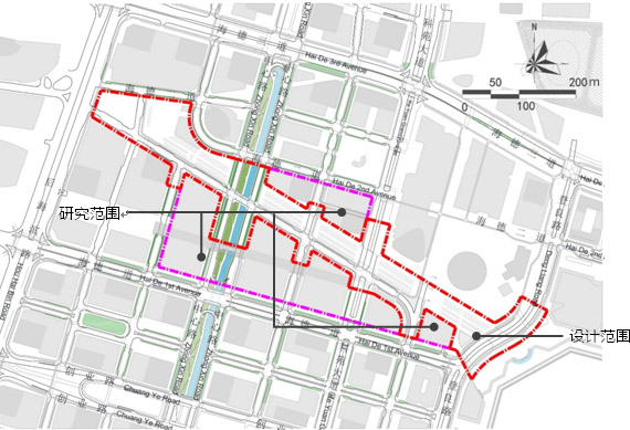 規(guī)劃設(shè)計(jì)范圍面積6.3公頃,研究范圍面積4.8公頃。包含二層連廊980M、地面線性景觀18100M2、地下空間40660M2每層,擬建2層,范圍如下圖: