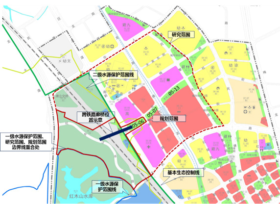 The planning design scope: about 28.4 ha., extending to Fulong Avenue in the west, the greenbelt of Guangdong-Shenzhen High-speed Railway and Minwang Street in the north, the planning road for Xinhua Hospital and the First-class Drinking Water Protection Line of Changlingpi Reservoir in the south, New District Avenue and Changshun Road in the east, and contains the site preliminarily selected for the cross-railway corridor bridge, Plot 05-02, Plot 05-06 for the Cultural Park, the Hongmu Mountain Eco-area and part of the railway area.