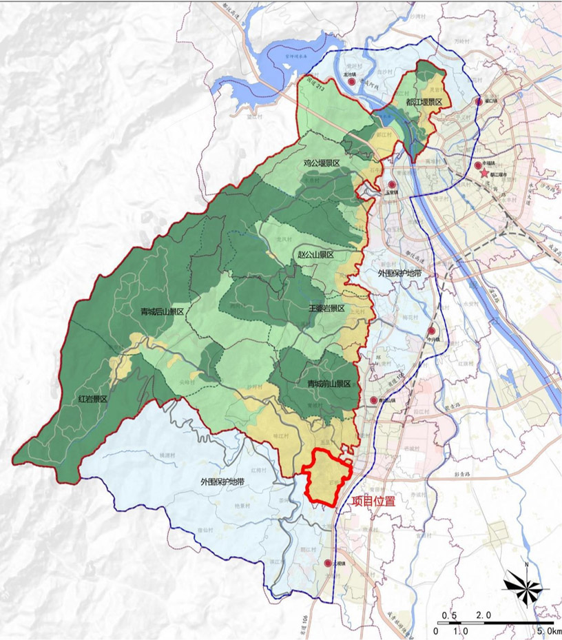 The project is backed by Qingcheng Mountain, north to Dujiangyan, and south to Jiezi Old Town. It is located in the core area of Dujiangyan-Qingchengshan-Jianzi Old Town Tourism Development Zone. It is 60 kilometers away from the downtown Chengdu. There are Chengdu-Chongqing Expressway, Chengqing Express, Shaxi Express Line, Tianfu Avenue and Chengguan Express Rail five fast transportation lines connected to the urban area. It can reach the Chengdu downtown and Chengdu Shuangliu International Airport in one hour.
