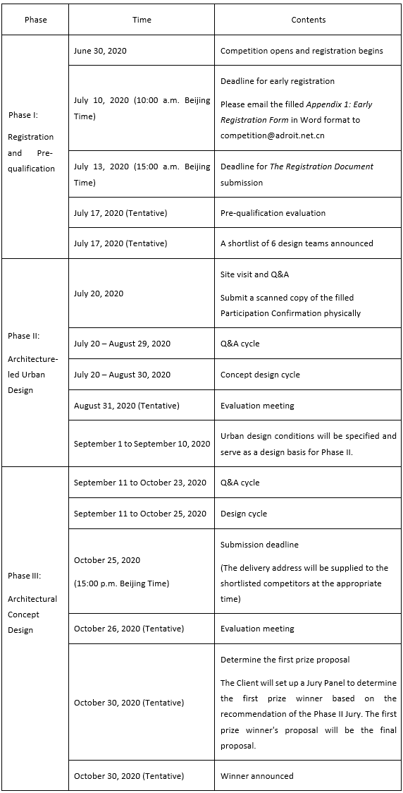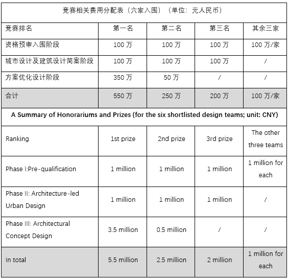 The six shortlisted teams through the pre-qualification will each receive an honorarium of CNY 1 million for completing the Phase II (Architecture-led Urban Design). An extra honorarium of CNY 1 million will be provided to each of the three shortlisted teams at Phase II for completing the Phase III (Architectural Concept Design).