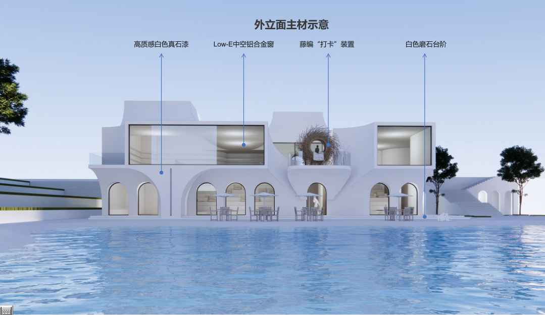 本作品是所有主立面造型以矩形為主的方案里最有內(nèi)涵的一個(gè),觀湖的朝向設(shè)計(jì)敢于創(chuàng)新,屋面與北側(cè)臺地結(jié)合巧秒流暢,極大增加了業(yè)主的生活趣味性,即使沒有進(jìn)入建筑,也能領(lǐng)略到它的魅力,尤其是設(shè)計(jì)者在設(shè)計(jì)建筑的過程中還精心考慮到了LOGO的位置,是眾多參賽作品中唯一一例。