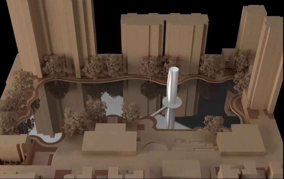 是所有入選方案中最具現(xiàn)代雕塑感的一個。強調(diào)了形體的非線性、材料的 沖擊感。透光混凝土在燈塔的獨特運用,配合中空的光環(huán),頗具網(wǎng)紅氣質(zhì)。通過中部環(huán)上開槽,加上燈帶開成一圈一圈的光環(huán),三面的透光結(jié)構(gòu)空隙,讓 整個街區(qū)以及社區(qū)居民都可以感受燈塔的光環(huán),中間的環(huán)狀,又象征著團結(jié), 友愛,領(lǐng)里一家親的氛圍