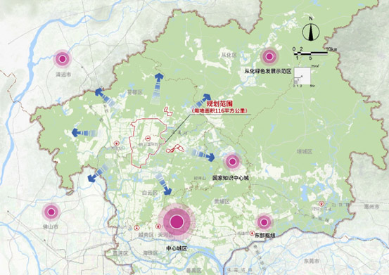 規(guī)劃范圍:空港經濟區(qū)116平方公里,東至流溪河、南至北二環(huán)高速、西至鐵山河—106 國道—鏡湖大道、北至花都大道,加上原白云機場綜合保稅區(qū)北區(qū)和南區(qū)范圍。