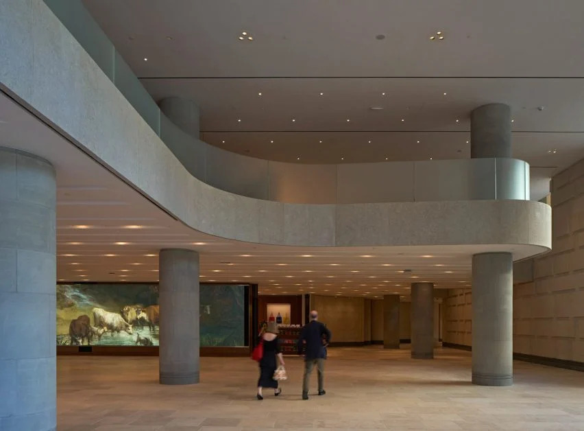 塞爾多夫工作室(Selldorf Architects)與英國(guó)珀塞爾建筑工作室(Purcell)合作,保留了該建筑的一些原始特征。兩個(gè)現(xiàn)有的粗琢柱、埃及圖案柱和一個(gè)切割的石灰?guī)r供體墻被重新安置在畫(huà)廊的其他地方。