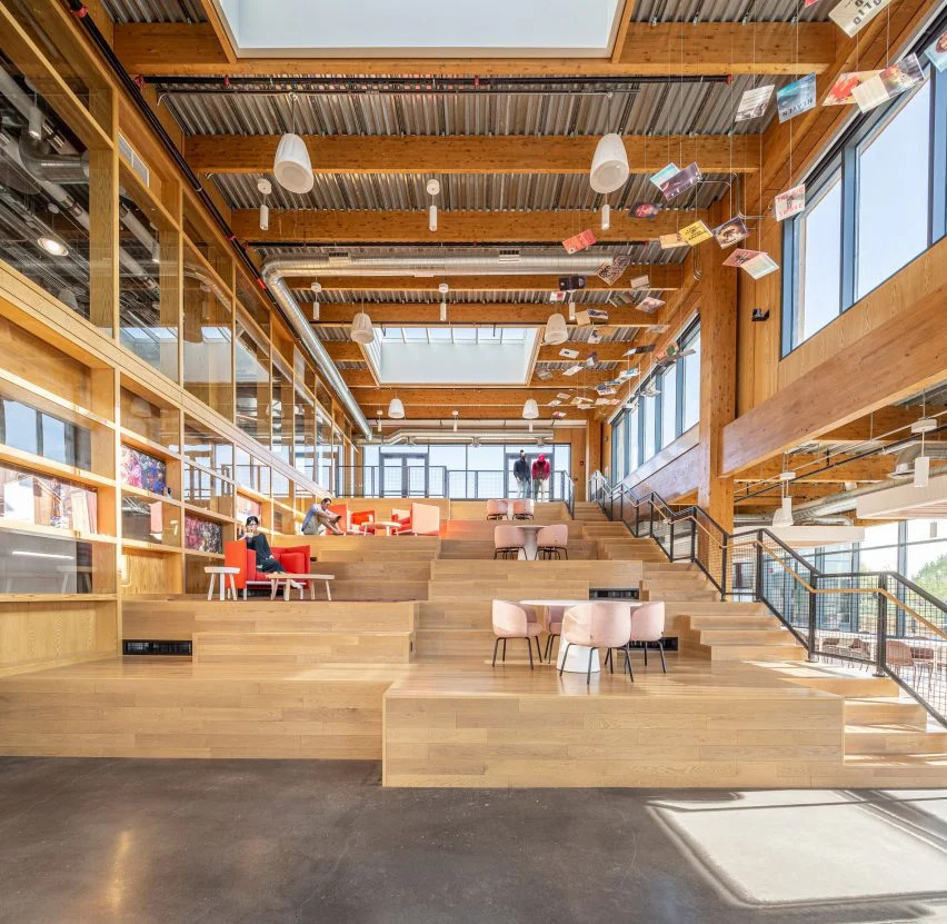 建筑的中心是一個(gè)木制的“社區(qū)樓梯”,人們可以在那里閑逛和交流。頭頂上,一個(gè)巨大的天窗引入了自然光。
