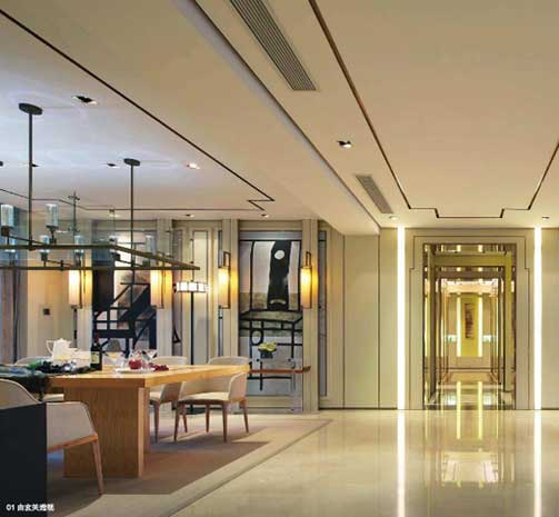 本案位于佛山千燈湖,室內設計延續(xù)了建筑ARTDECO的風格特征,融合了新古典主義的精髓,通過了立面裝飾,空間組織、陳設布置,色彩表現等將“當代性”、“文化性”、“藝術性”以及東方傳統(tǒng)文化的精神內涵,共融、共生在同一空間中。將中國傳統(tǒng)繪畫中“虛”與“實”的概念貫穿于本案設計的始終,講究設計的“圖”“底”關系。在整體設計中,沒有復雜的墻面附著和多層次的室內色彩,設計師利用四壁落白的墻體效果,溫和的木質板材,沉穩(wěn)的大理石地面,配合溫暖的黃色燈光塑造了仿若中國畫中的“留白”般靜怡祥和、禪意攜永的哲理空間,營造出空間的延伸感。而室內的陳設的家具和裝飾品則使用了顯性的表現手法,直接利用東方元素給居住者帶來東方式情感的體驗。那些具有明清遺韻的新古典主義家具,原木矮機、案臺,頗具漢風的宮燈式燈具,甚至是一指瓷瓶,一潭清茶,一支洋蘭,一張鋪著絲綢的軟塌,一副王懷慶的繪畫,這種種通過本身的材質和造型,將它們所代表的東方文化屬性直接傳遞給受眾,將這空間的東方意境坐實,做真,在虛無間感受暖暖流動的時光,就像中國畫一般更注重的是對時空的氣韻的理解。