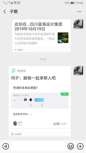 應(yīng)用場(chǎng)景二:我在趕來(lái)見(jiàn)馬云的路上,大霧,全城堵車(chē),塞在出租內(nèi)動(dòng)彈不得。此時(shí)打開(kāi)“問(wèn)吧”,發(fā)布交通協(xié)助的需求,懸賞20塊。1分鐘后,一位蹬自行車(chē)的帥哥出現(xiàn)在面前,載我穿越各種小巷,準(zhǔn)時(shí)出現(xiàn)在馬云辦公室!业玫揭粋(gè)“順風(fēng)車(chē)”。