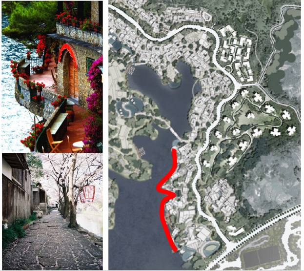 御湖小鎮(zhèn)沿湖環(huán)線內(nèi)按多組團(tuán)式進(jìn)行布置,強(qiáng)調(diào)組團(tuán)內(nèi)部空間序列的多樣性,各組團(tuán)之間在表現(xiàn)元素內(nèi)容和手法上需有差異性變化;建筑布置方式可采用單體式、圍合式、院落式進(jìn)行布置、或多個(gè)建筑單體合理組合的建筑群體方式,體現(xiàn)開合、收放、疏密的自然空間序列,整個(gè)小鎮(zhèn)內(nèi)應(yīng)考慮多個(gè)公共人流集散節(jié)點(diǎn)空間,每個(gè)節(jié)點(diǎn)空間都應(yīng)設(shè)置具有昭示性標(biāo)識(shí)的重點(diǎn)建筑(例如:藝術(shù)建筑、景觀建筑、文化建筑)。