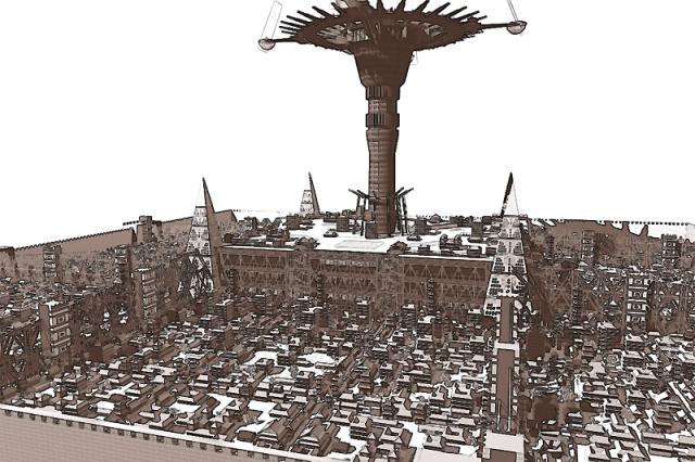 背景是“極盛”的唐,設(shè)想一種極致發(fā)達(dá)的“古文明”。也許文明不是一條線走下來(lái)的,誰(shuí)說(shuō)不能走其它路線而達(dá)到另一種境界呢?這是一個(gè)幻想設(shè)計(jì),盡管受限于我的建模水平和機(jī)器狀況,只能做到這一步,但還是希望可以激發(fā)一些想象力