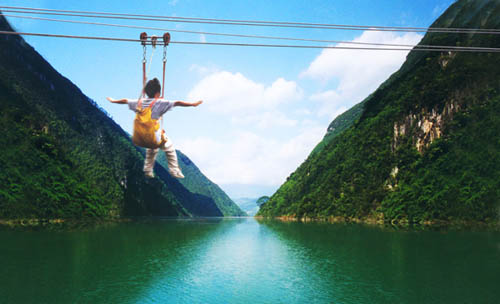 這樣經(jīng)歷了幾次險灘后,我們也適應(yīng)了,反正都打濕了,也不怕了,到還覺得那過險灘時刺激好玩。到了水流平緩的地方,大家就又輕松地說笑打鬧,或欣賞著兩岸美麗的風(fēng)光。看著那清澈的江水,我想游泳了,征得舵手的同意,就脫了救生衣,穿著長褲,扎著皮帶,站在船頭,以一個優(yōu)美的姿勢扎了下去。我在那水里游著,因為是穿的長褲,看起來怪怪的,船上的人哄堂大笑,說我就象一條美人魚。我跟著橡皮船悠閑地游著,一會看看兩岸的景色,一會看看蘭天,一會看看清澈的江底,那感覺好極了。游累了就爬上船來,想起了就一個猛子扎下江里去。看見岸邊有美麗的野花,那些女孩子要要,我就游過去幫她們摘來。那些女孩子把花編成花環(huán)戴在頭上,下面是濕漉漉的頭發(fā)和緊貼身的衣裙,看起來倒還有一種野性的美。