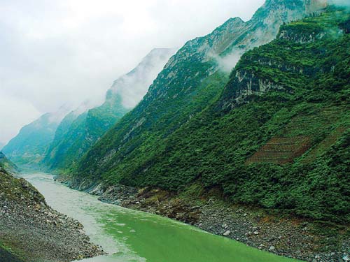 一會那舵手提醒我們了,要到激流險灘了,請大家坐好,抓好船邊的繩索。正當(dāng)大家還沒從那悠閑輕松的心情中轉(zhuǎn)換過來,就聽見前面轟隆隆的浪潮聲,我們的船速聚然加快,還沒來得急看清是怎么回事,就被沖入一個峽口。一米高的浪頭劈頭蓋臉地打來,只覺得全身一涼,趕緊自然地閉氣和抓緊繩索。一會從浪頭中鉆出來,趕忙吸氣,又看見第二個浪頭劈頭蓋臉打來了。那樣緊接著了五、六下,才漂過了那危險區(qū),這時船上一片哭聲。原來是那些坐前面的女孩,哪里經(jīng)歷過如此驚魂,此時全船灌滿了水,人人都成了落湯雞坐在水中。特別是那些女孩子,一個個披頭散發(fā),先前的瀟灑飄逸全沒有了。男的一個個那緊裹的西裝、制服,此時也成了難受的濕包裹,于是不管什么風(fēng)度了,紛紛脫掉,打著赤膊。女孩子們又紛紛掉換座位,都換到后面,找高大的男同胞身后靠。