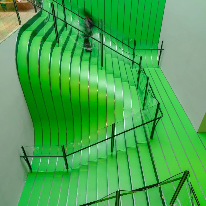 隨著空間的翻新,該工作室向山丘的隱喻傾斜,將巨大的樓梯間重新涂上瓏驤(Longchamp)標(biāo)志性的能源綠色(Energy Green)。