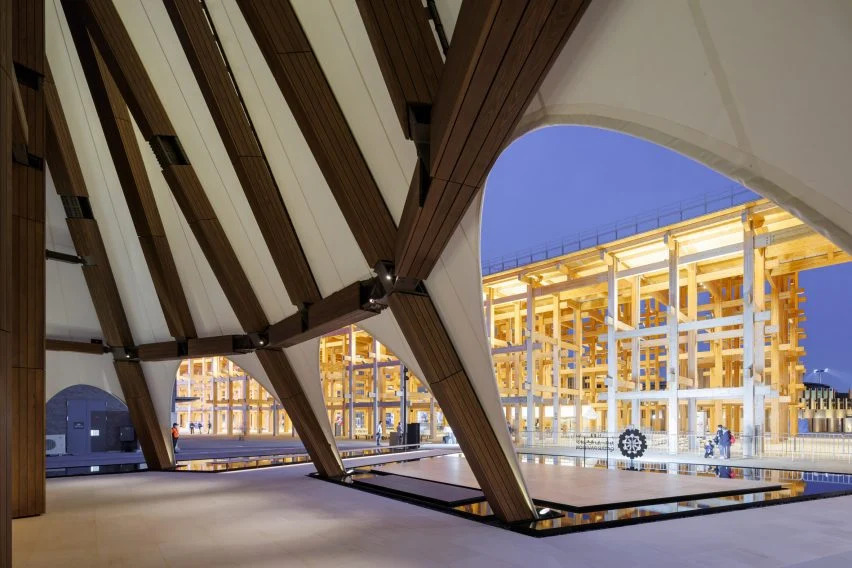 世博會(huì)的所有展館都包含在一個(gè)由日本藤本壯介建筑師事務(wù)所(Sou Fujimoto Architects)設(shè)計(jì)的環(huán)形木結(jié)構(gòu)內(nèi),該建筑被稱為世界上最大的木結(jié)構(gòu)。